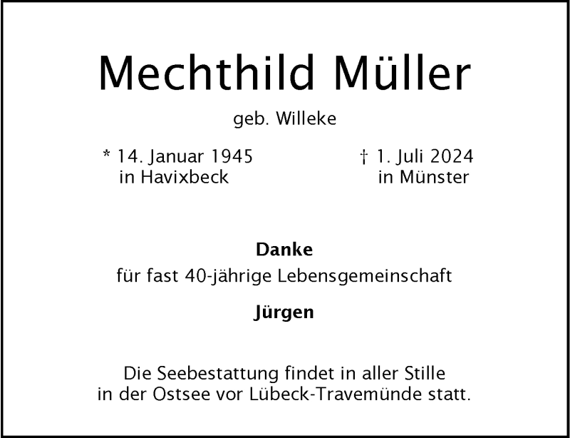 Hier finden Sie alle Traueranzeigen aus der Zeitung, die bisher für Mechthild Müller erschienen sind. Weitere Traueranzeigen, die in der Zeitung erscheinen, werden hier ebenfalls aufgelistet