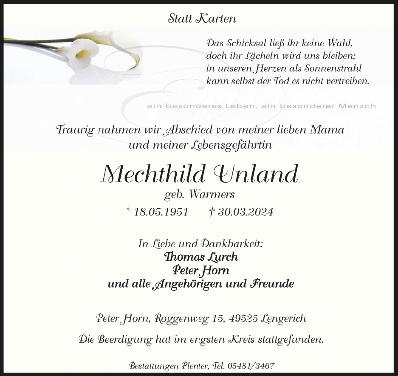 Hier finden Sie alle Traueranzeigen aus der Zeitung, die bisher für Mechthild Unland erschienen sind. Weitere Traueranzeigen, die in der Zeitung erscheinen, werden hier ebenfalls aufgelistet