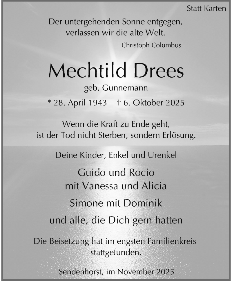 Hier finden Sie alle Traueranzeigen aus der Zeitung, die bisher für Mechtild Drees erschienen sind. Weitere Traueranzeigen, die in der Zeitung erscheinen, werden hier ebenfalls aufgelistet