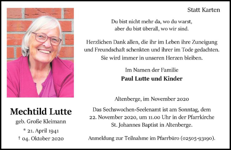 Hier finden Sie alle Traueranzeigen aus der Zeitung, die bisher für Mechtild Lutte erschienen sind. Weitere Traueranzeigen, die in der Zeitung erscheinen, werden hier ebenfalls aufgelistet