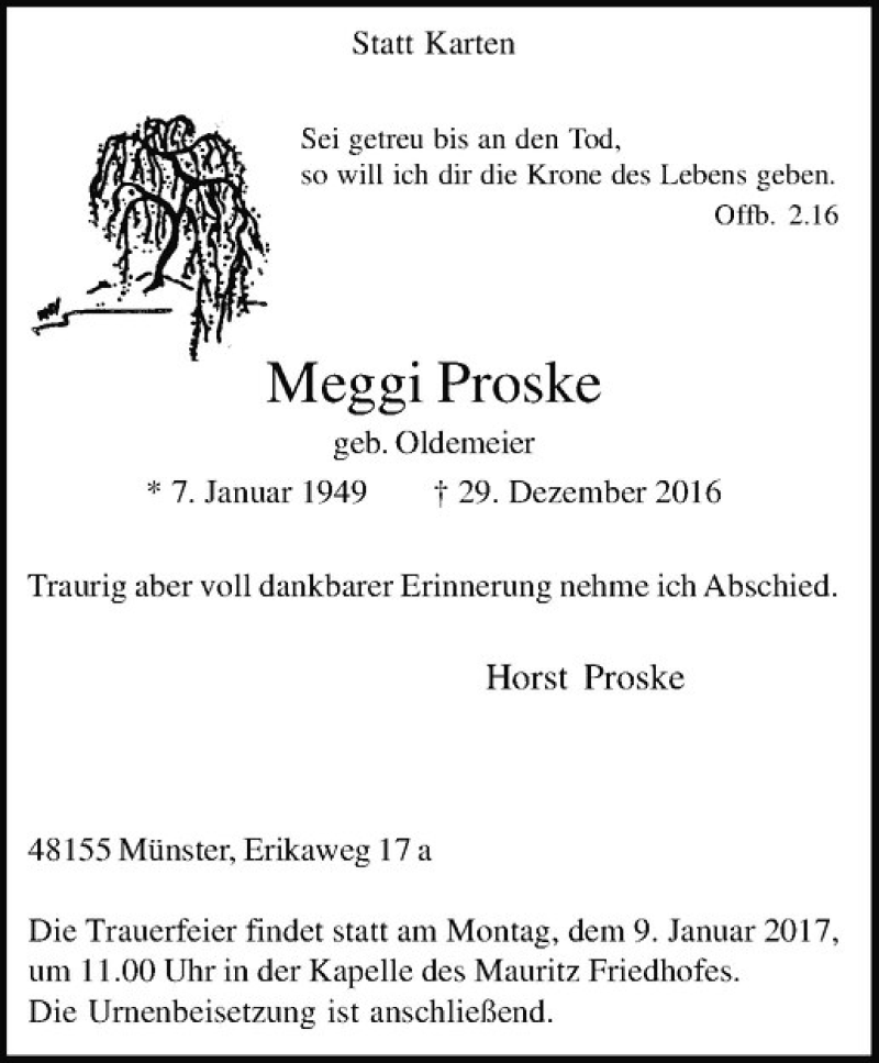Hier finden Sie alle Traueranzeigen aus der Zeitung, die bisher für Meggi Proske erschienen sind. Weitere Traueranzeigen, die in der Zeitung erscheinen, werden hier ebenfalls aufgelistet