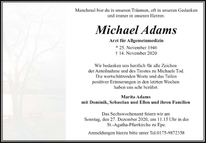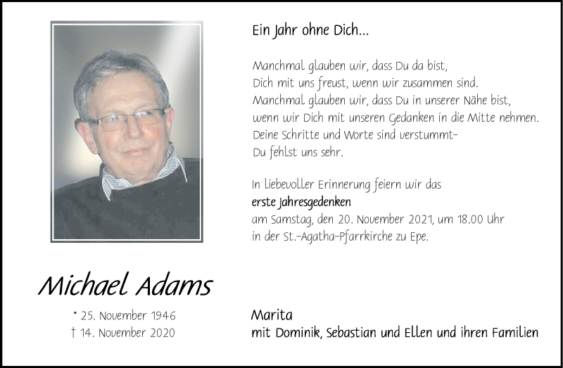 Hier finden Sie alle Traueranzeigen aus der Zeitung, die bisher für Michael Adams erschienen sind. Weitere Traueranzeigen, die in der Zeitung erscheinen, werden hier ebenfalls aufgelistet