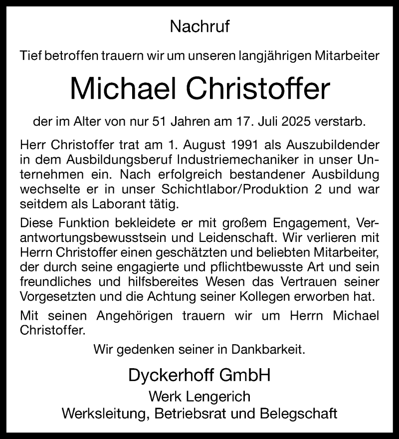 Hier finden Sie alle Traueranzeigen aus der Zeitung, die bisher für Michael Christoffer erschienen sind. Weitere Traueranzeigen, die in der Zeitung erscheinen, werden hier ebenfalls aufgelistet