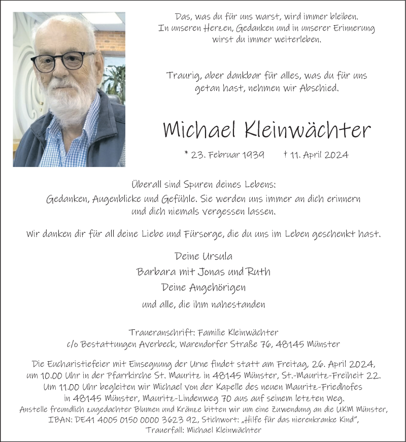 Hier finden Sie alle Traueranzeigen aus der Zeitung, die bisher für Michael Kleinwächter erschienen sind. Weitere Traueranzeigen, die in der Zeitung erscheinen, werden hier ebenfalls aufgelistet