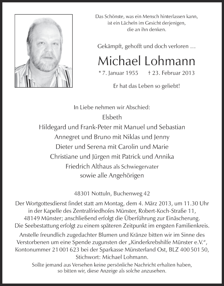 Hier finden Sie alle Traueranzeigen aus der Zeitung, die bisher für Michael Lohmann erschienen sind. Weitere Traueranzeigen, die in der Zeitung erscheinen, werden hier ebenfalls aufgelistet