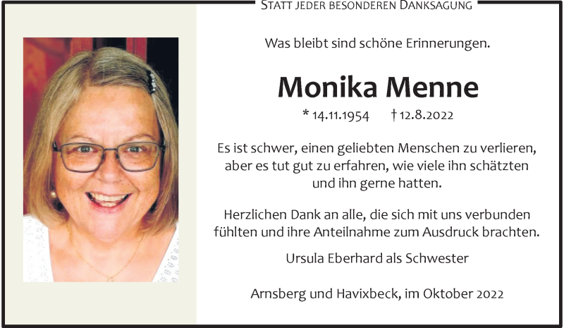 Hier finden Sie alle Traueranzeigen aus der Zeitung, die bisher für Monika Menne erschienen sind. Weitere Traueranzeigen, die in der Zeitung erscheinen, werden hier ebenfalls aufgelistet