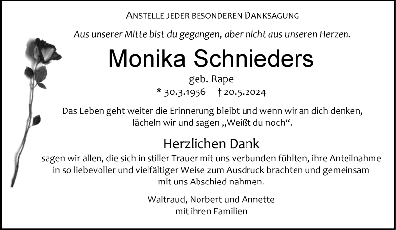 Hier finden Sie alle Traueranzeigen aus der Zeitung, die bisher für Monika Schnieders erschienen sind. Weitere Traueranzeigen, die in der Zeitung erscheinen, werden hier ebenfalls aufgelistet