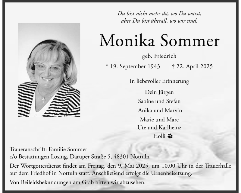 Hier finden Sie alle Traueranzeigen aus der Zeitung, die bisher für Monika Sommer erschienen sind. Weitere Traueranzeigen, die in der Zeitung erscheinen, werden hier ebenfalls aufgelistet