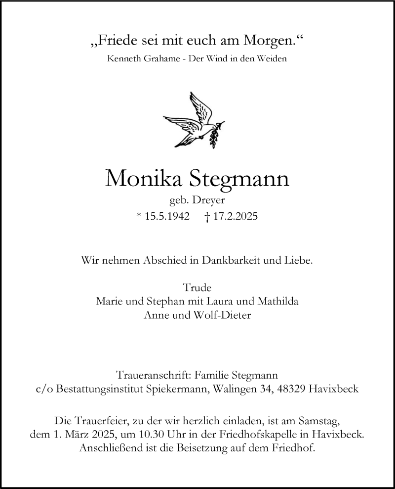 Hier finden Sie alle Traueranzeigen aus der Zeitung, die bisher für Monika Stegmann erschienen sind. Weitere Traueranzeigen, die in der Zeitung erscheinen, werden hier ebenfalls aufgelistet