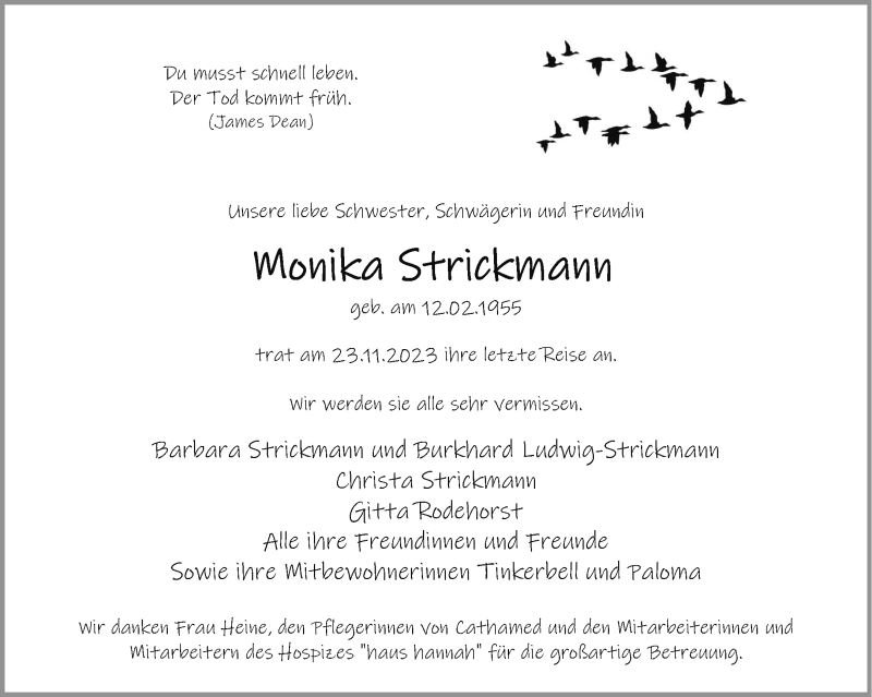 Hier finden Sie alle Traueranzeigen aus der Zeitung, die bisher für Monika Strickmann erschienen sind. Weitere Traueranzeigen, die in der Zeitung erscheinen, werden hier ebenfalls aufgelistet