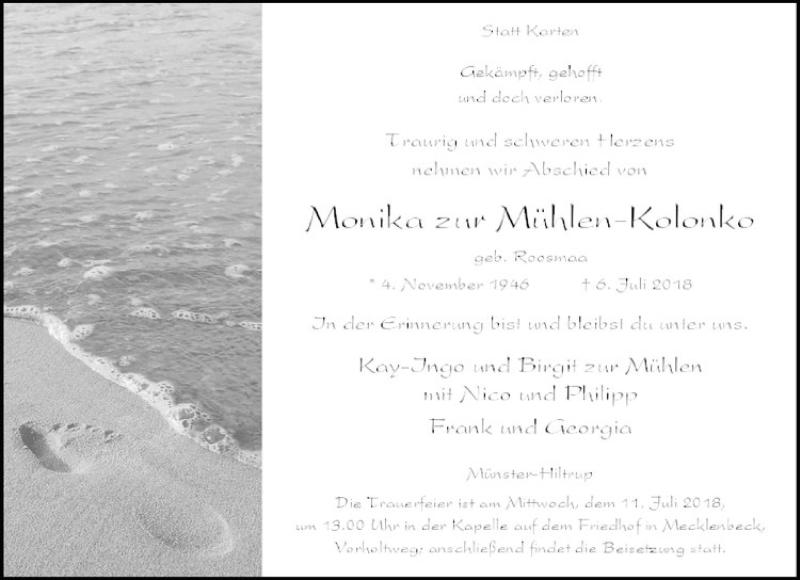 Hier finden Sie alle Traueranzeigen aus der Zeitung, die bisher für Monika zur Mühlen-Kolonko erschienen sind. Weitere Traueranzeigen, die in der Zeitung erscheinen, werden hier ebenfalls aufgelistet