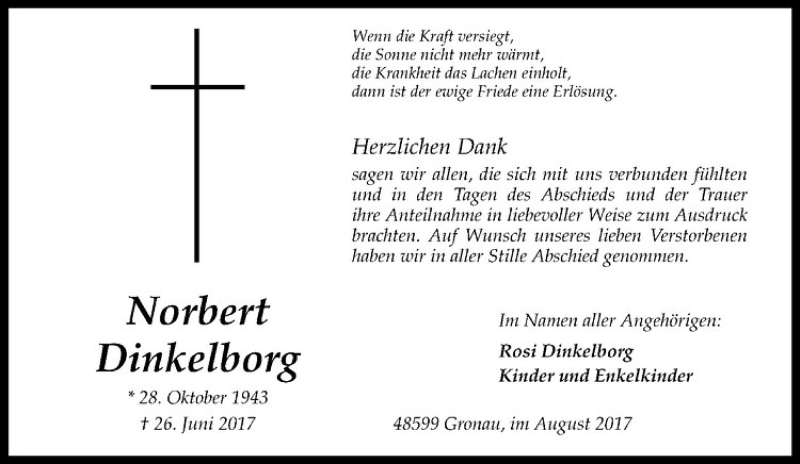 Hier finden Sie alle Traueranzeigen aus der Zeitung, die bisher für Norbert Dinkelborg erschienen sind. Weitere Traueranzeigen, die in der Zeitung erscheinen, werden hier ebenfalls aufgelistet