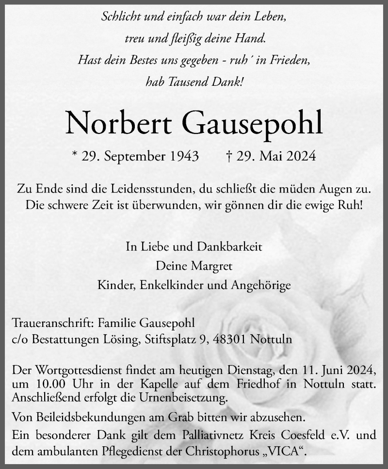 Hier finden Sie alle Traueranzeigen aus der Zeitung, die bisher für Norbert Gausepohl erschienen sind. Weitere Traueranzeigen, die in der Zeitung erscheinen, werden hier ebenfalls aufgelistet