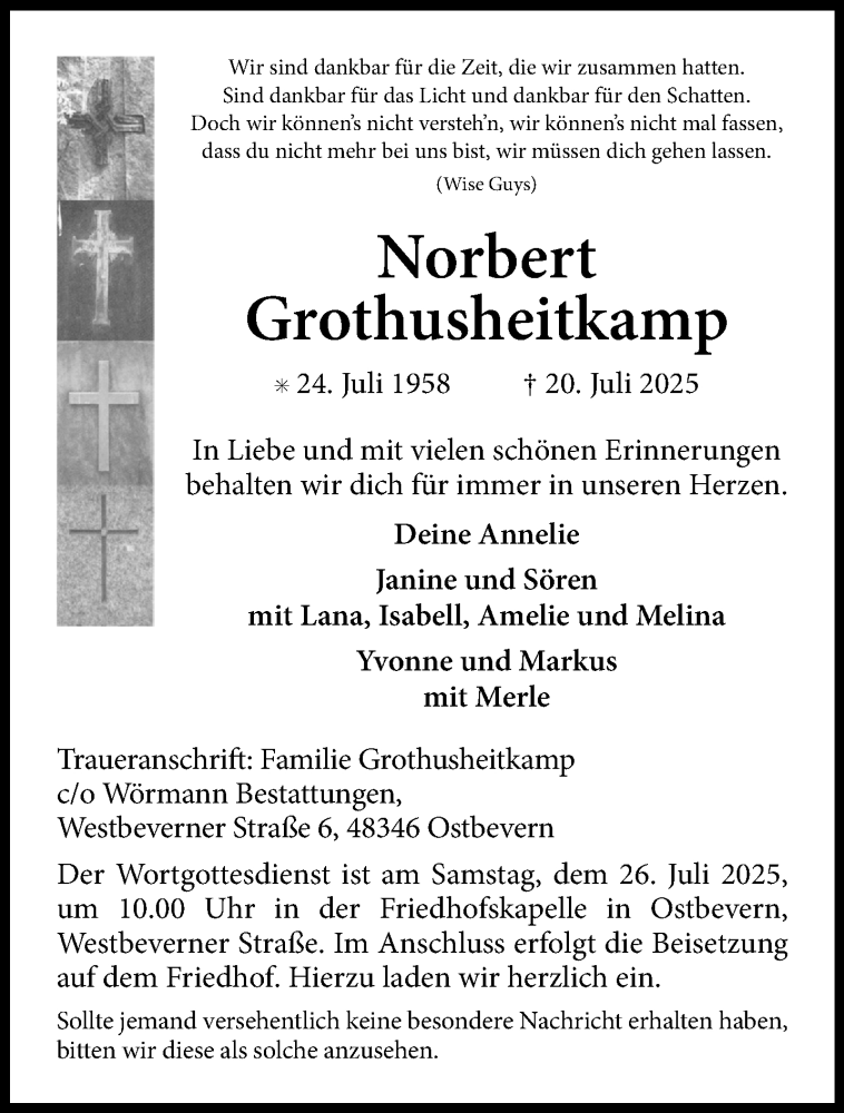 Hier finden Sie alle Traueranzeigen aus der Zeitung, die bisher für Norbert Grothusheitkamp erschienen sind. Weitere Traueranzeigen, die in der Zeitung erscheinen, werden hier ebenfalls aufgelistet