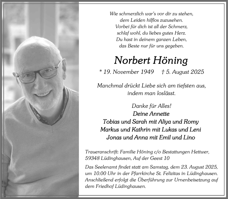 Hier finden Sie alle Traueranzeigen aus der Zeitung, die bisher für Norbert Höning erschienen sind. Weitere Traueranzeigen, die in der Zeitung erscheinen, werden hier ebenfalls aufgelistet