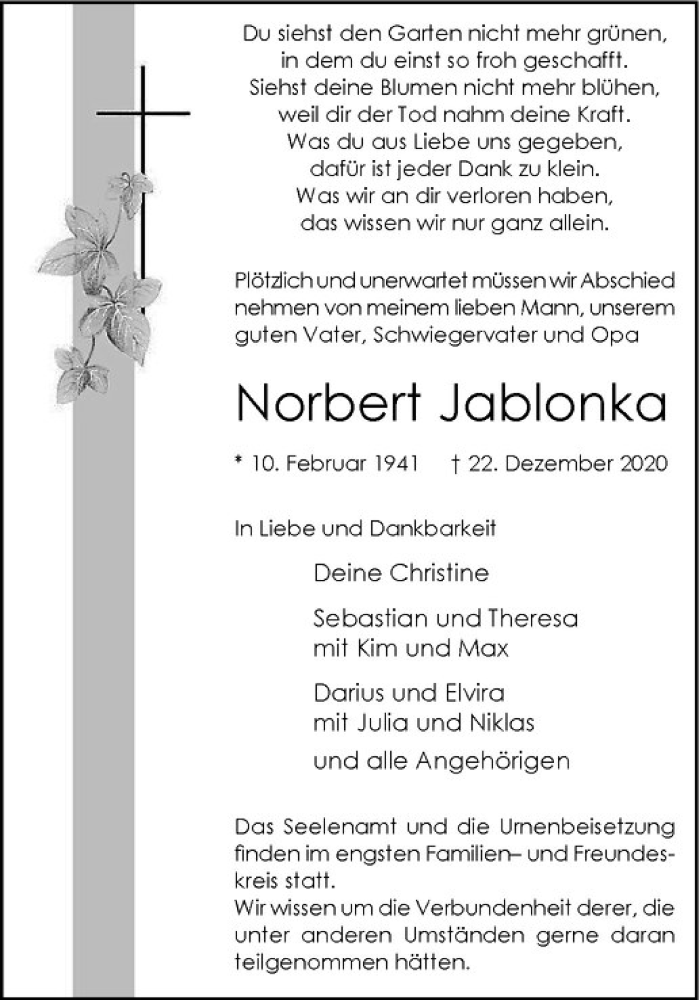 Hier finden Sie alle Traueranzeigen aus der Zeitung, die bisher für Norbert Jablonka erschienen sind. Weitere Traueranzeigen, die in der Zeitung erscheinen, werden hier ebenfalls aufgelistet