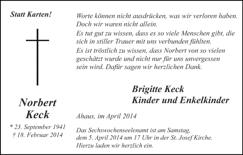 Hier finden Sie alle Traueranzeigen aus der Zeitung, die bisher für Norbert Keck erschienen sind. Weitere Traueranzeigen, die in der Zeitung erscheinen, werden hier ebenfalls aufgelistet