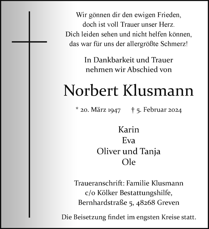 Hier finden Sie alle Traueranzeigen aus der Zeitung, die bisher für Norbert Klusmann erschienen sind. Weitere Traueranzeigen, die in der Zeitung erscheinen, werden hier ebenfalls aufgelistet