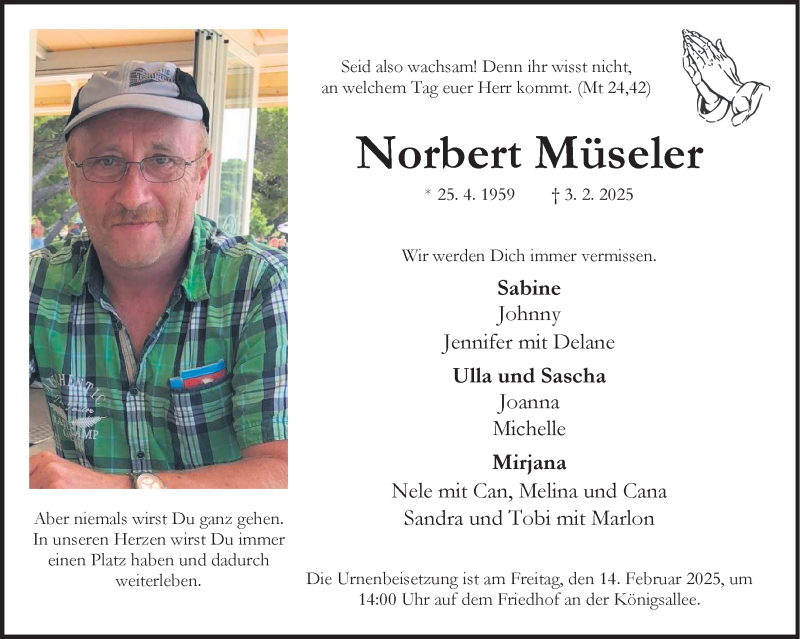 Hier finden Sie alle Traueranzeigen aus der Zeitung, die bisher für Norbert Müseler erschienen sind. Weitere Traueranzeigen, die in der Zeitung erscheinen, werden hier ebenfalls aufgelistet
