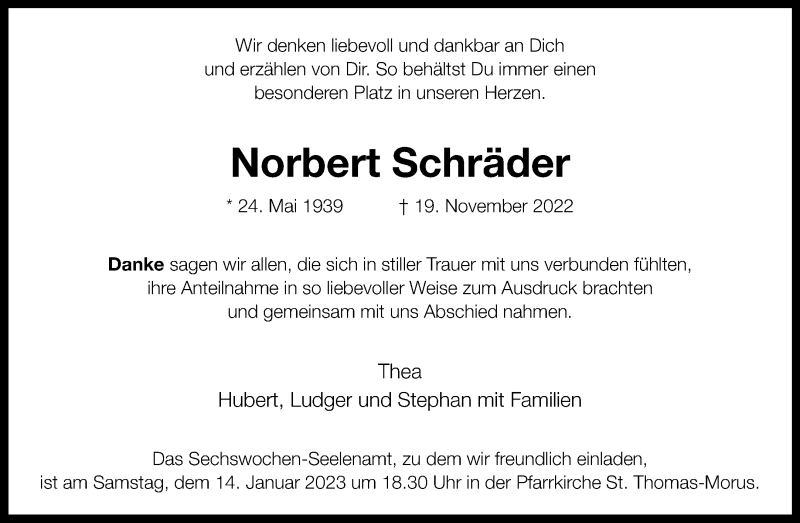 Hier finden Sie alle Traueranzeigen aus der Zeitung, die bisher für Norbert Schräder erschienen sind. Weitere Traueranzeigen, die in der Zeitung erscheinen, werden hier ebenfalls aufgelistet