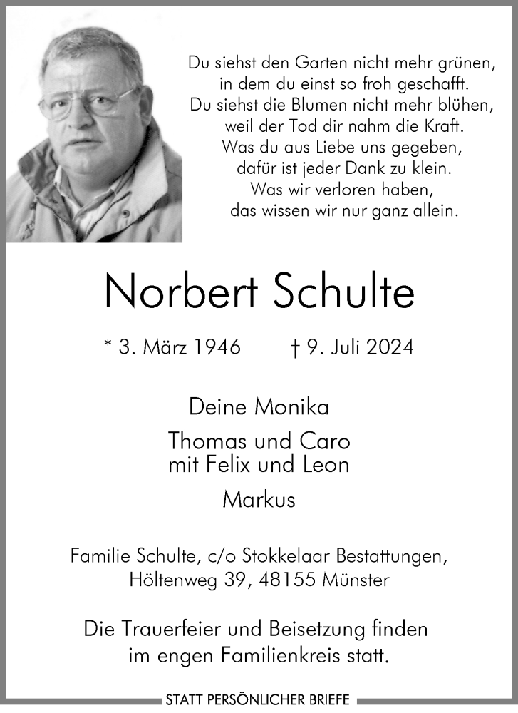 Hier finden Sie alle Traueranzeigen aus der Zeitung, die bisher für Norbert Schulte erschienen sind. Weitere Traueranzeigen, die in der Zeitung erscheinen, werden hier ebenfalls aufgelistet
