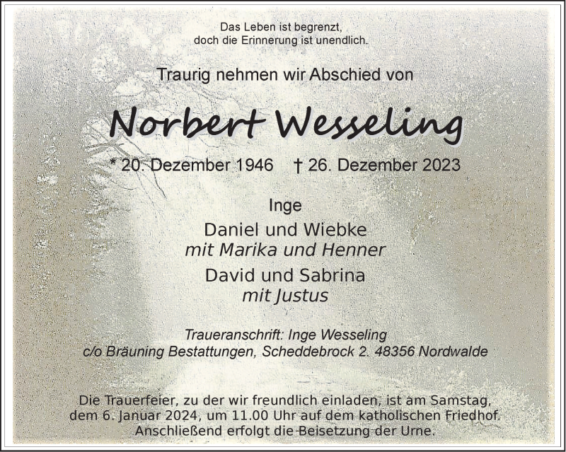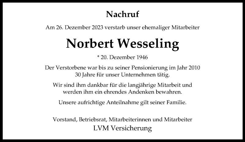 Hier finden Sie alle Traueranzeigen aus der Zeitung, die bisher für Norbert Wesseling erschienen sind. Weitere Traueranzeigen, die in der Zeitung erscheinen, werden hier ebenfalls aufgelistet