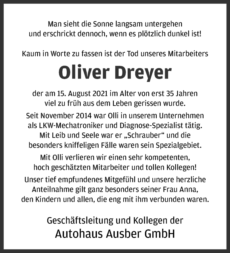 Hier finden Sie alle Traueranzeigen aus der Zeitung, die bisher für Oliver Dreyer erschienen sind. Weitere Traueranzeigen, die in der Zeitung erscheinen, werden hier ebenfalls aufgelistet