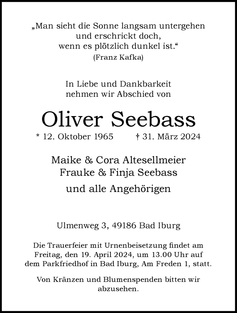 Hier finden Sie alle Traueranzeigen aus der Zeitung, die bisher für Oliver Seebass erschienen sind. Weitere Traueranzeigen, die in der Zeitung erscheinen, werden hier ebenfalls aufgelistet