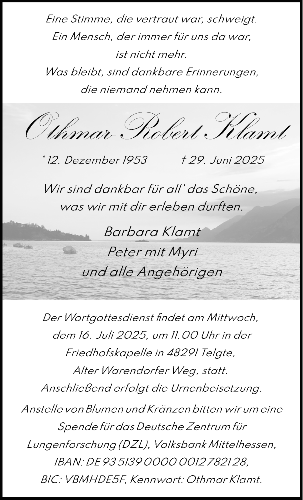 Hier finden Sie alle Traueranzeigen aus der Zeitung, die bisher für Othmar Robert Klamt erschienen sind. Weitere Traueranzeigen, die in der Zeitung erscheinen, werden hier ebenfalls aufgelistet