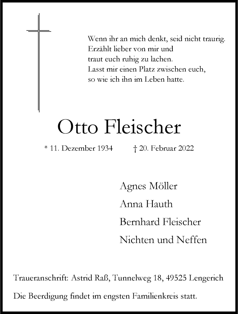 Hier finden Sie alle Traueranzeigen aus der Zeitung, die bisher für Otto Fleischer erschienen sind. Weitere Traueranzeigen, die in der Zeitung erscheinen, werden hier ebenfalls aufgelistet