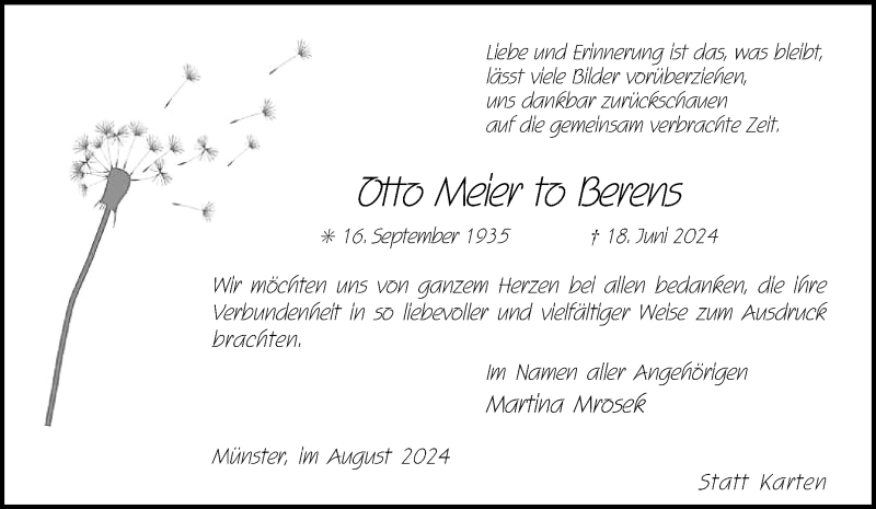 Hier finden Sie alle Traueranzeigen aus der Zeitung, die bisher für Otto Meier To Berens erschienen sind. Weitere Traueranzeigen, die in der Zeitung erscheinen, werden hier ebenfalls aufgelistet