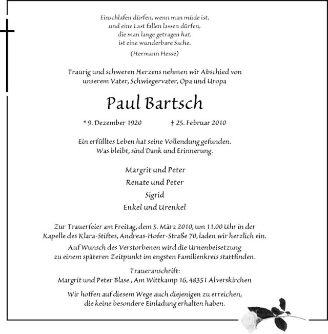 Hier finden Sie alle Traueranzeigen aus der Zeitung, die bisher für Paul Bartsch erschienen sind. Weitere Traueranzeigen, die in der Zeitung erscheinen, werden hier ebenfalls aufgelistet