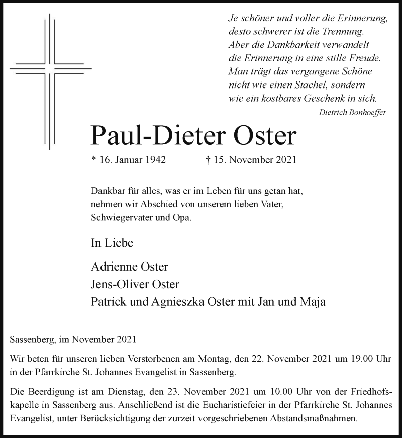 Hier finden Sie alle Traueranzeigen aus der Zeitung, die bisher für Paul-Dieter Oster erschienen sind. Weitere Traueranzeigen, die in der Zeitung erscheinen, werden hier ebenfalls aufgelistet
