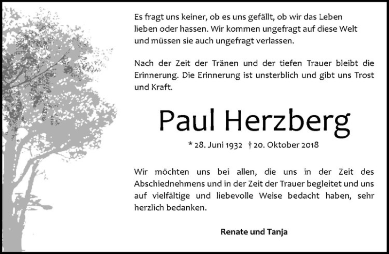 Hier finden Sie alle Traueranzeigen aus der Zeitung, die bisher für Paul Herzberg erschienen sind. Weitere Traueranzeigen, die in der Zeitung erscheinen, werden hier ebenfalls aufgelistet