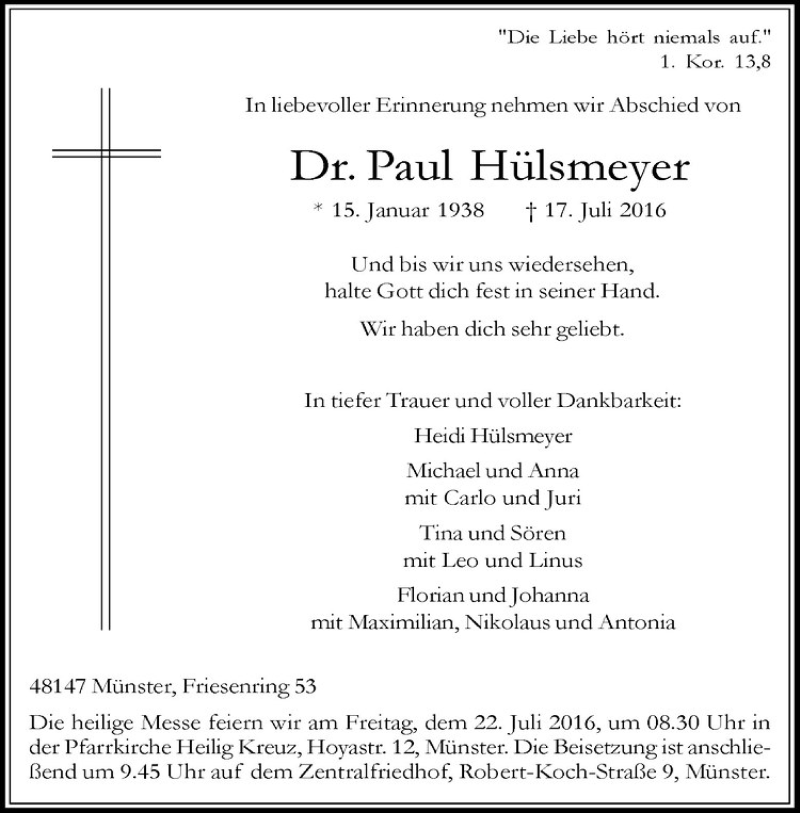 Hier finden Sie alle Traueranzeigen aus der Zeitung, die bisher für Paul Hülsmeyer erschienen sind. Weitere Traueranzeigen, die in der Zeitung erscheinen, werden hier ebenfalls aufgelistet