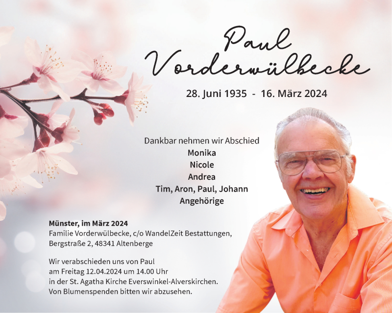 Hier finden Sie alle Traueranzeigen aus der Zeitung, die bisher für Paul Vorderwülbecke erschienen sind. Weitere Traueranzeigen, die in der Zeitung erscheinen, werden hier ebenfalls aufgelistet