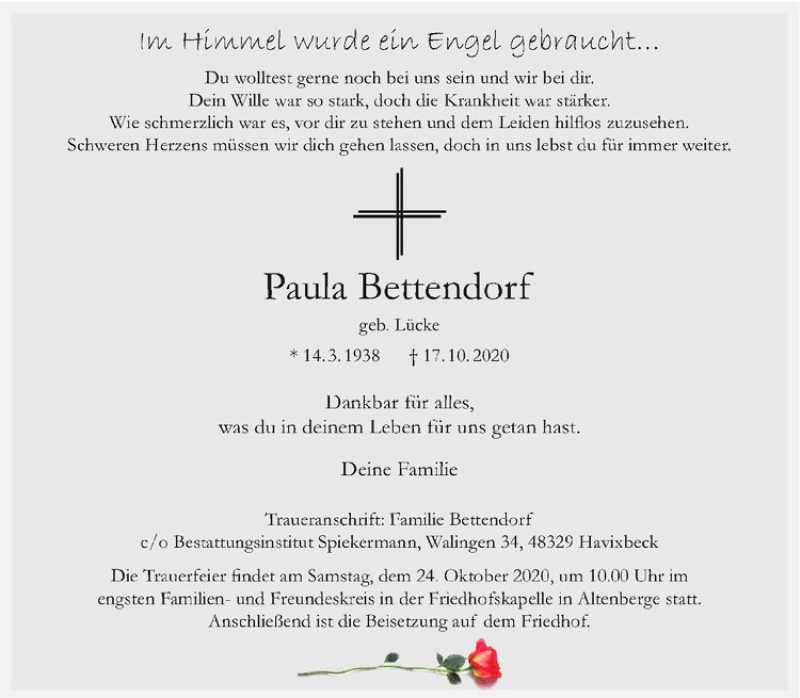 Hier finden Sie alle Traueranzeigen aus der Zeitung, die bisher für Paula Bettendorf erschienen sind. Weitere Traueranzeigen, die in der Zeitung erscheinen, werden hier ebenfalls aufgelistet