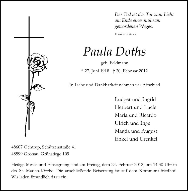 Hier finden Sie alle Traueranzeigen aus der Zeitung, die bisher für Paula Doths erschienen sind. Weitere Traueranzeigen, die in der Zeitung erscheinen, werden hier ebenfalls aufgelistet