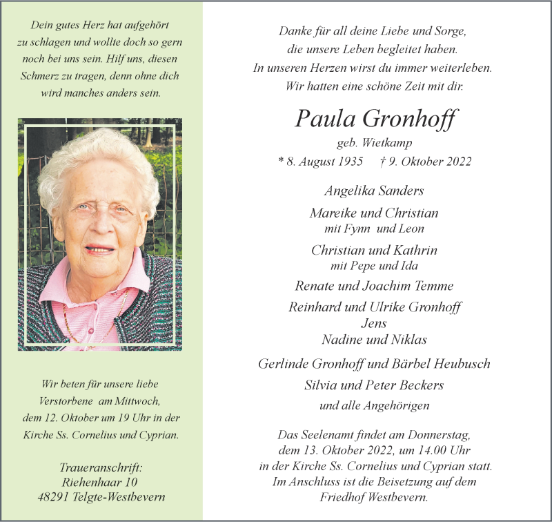 Hier finden Sie alle Traueranzeigen aus der Zeitung, die bisher für Paula Gronhoff erschienen sind. Weitere Traueranzeigen, die in der Zeitung erscheinen, werden hier ebenfalls aufgelistet