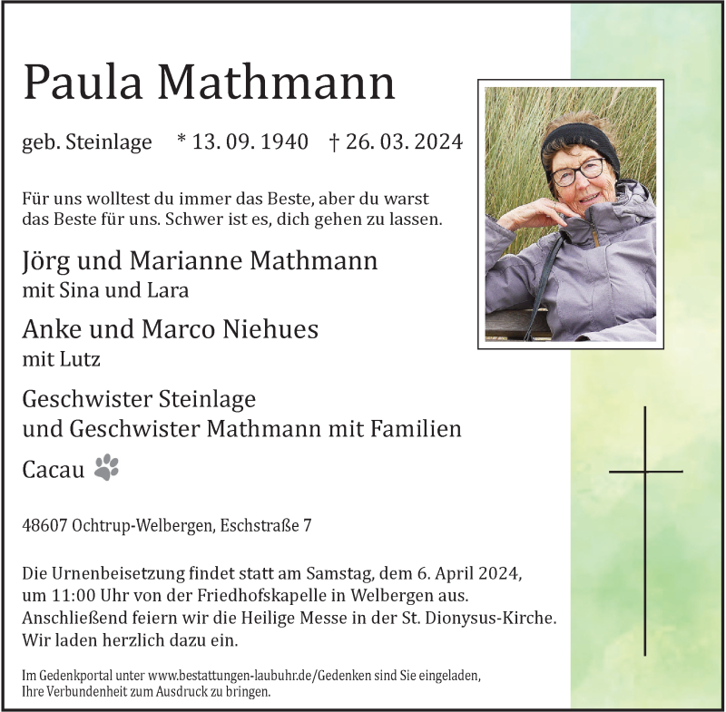 Hier finden Sie alle Traueranzeigen aus der Zeitung, die bisher für Paula Mathmann erschienen sind. Weitere Traueranzeigen, die in der Zeitung erscheinen, werden hier ebenfalls aufgelistet