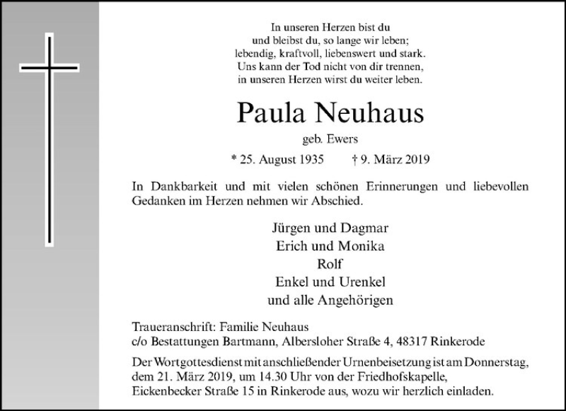 Hier finden Sie alle Traueranzeigen aus der Zeitung, die bisher für Paula Neuhaus erschienen sind. Weitere Traueranzeigen, die in der Zeitung erscheinen, werden hier ebenfalls aufgelistet