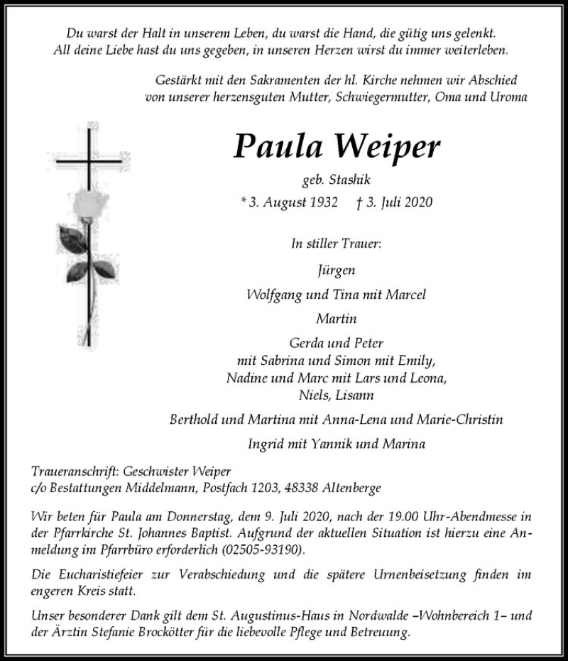 Hier finden Sie alle Traueranzeigen aus der Zeitung, die bisher für Paula Weißer erschienen sind. Weitere Traueranzeigen, die in der Zeitung erscheinen, werden hier ebenfalls aufgelistet