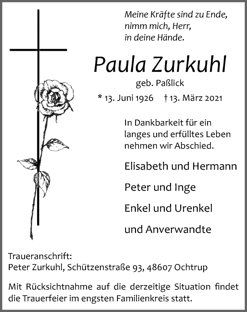 Hier finden Sie alle Traueranzeigen aus der Zeitung, die bisher für Paula Zurkuhl erschienen sind. Weitere Traueranzeigen, die in der Zeitung erscheinen, werden hier ebenfalls aufgelistet