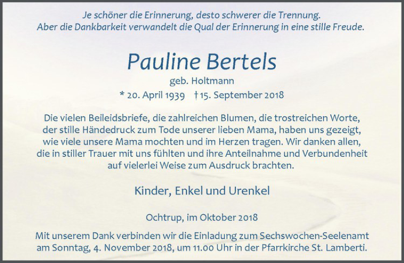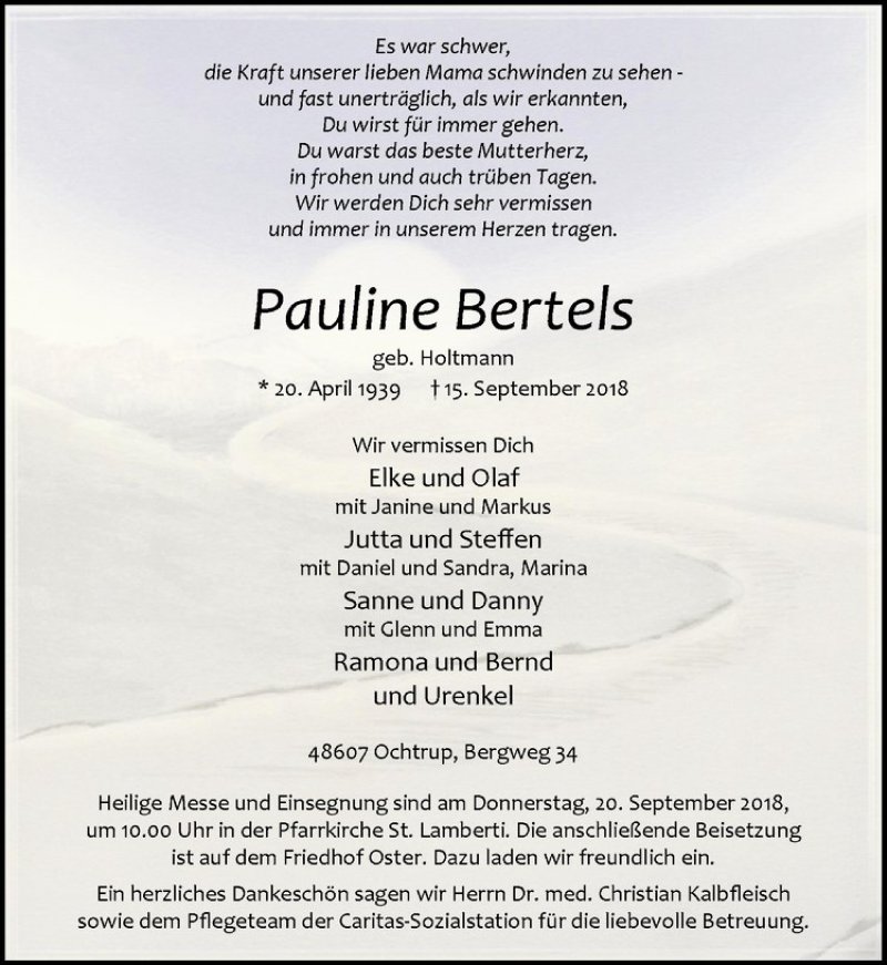 Hier finden Sie alle Traueranzeigen aus der Zeitung, die bisher für Pauline Bertels erschienen sind. Weitere Traueranzeigen, die in der Zeitung erscheinen, werden hier ebenfalls aufgelistet