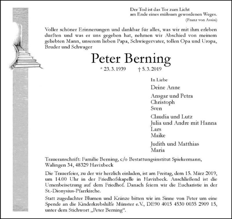 Hier finden Sie alle Traueranzeigen aus der Zeitung, die bisher für Peter Berning erschienen sind. Weitere Traueranzeigen, die in der Zeitung erscheinen, werden hier ebenfalls aufgelistet