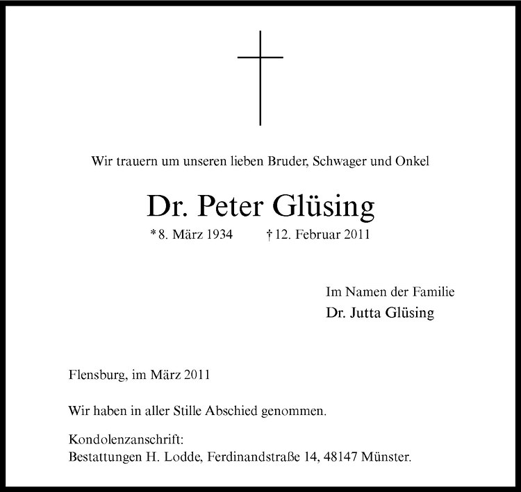 Hier finden Sie alle Traueranzeigen aus der Zeitung, die bisher für Peter Glüsing erschienen sind. Weitere Traueranzeigen, die in der Zeitung erscheinen, werden hier ebenfalls aufgelistet