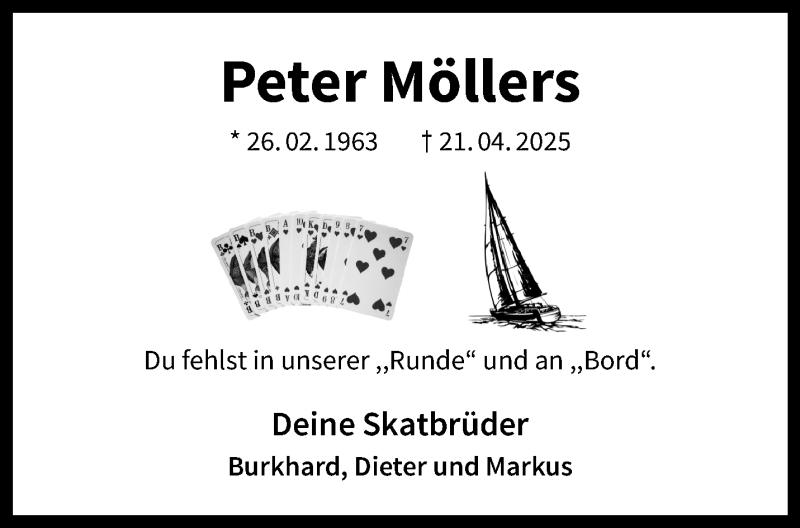 Hier finden Sie alle Traueranzeigen aus der Zeitung, die bisher für Peter Möllers erschienen sind. Weitere Traueranzeigen, die in der Zeitung erscheinen, werden hier ebenfalls aufgelistet