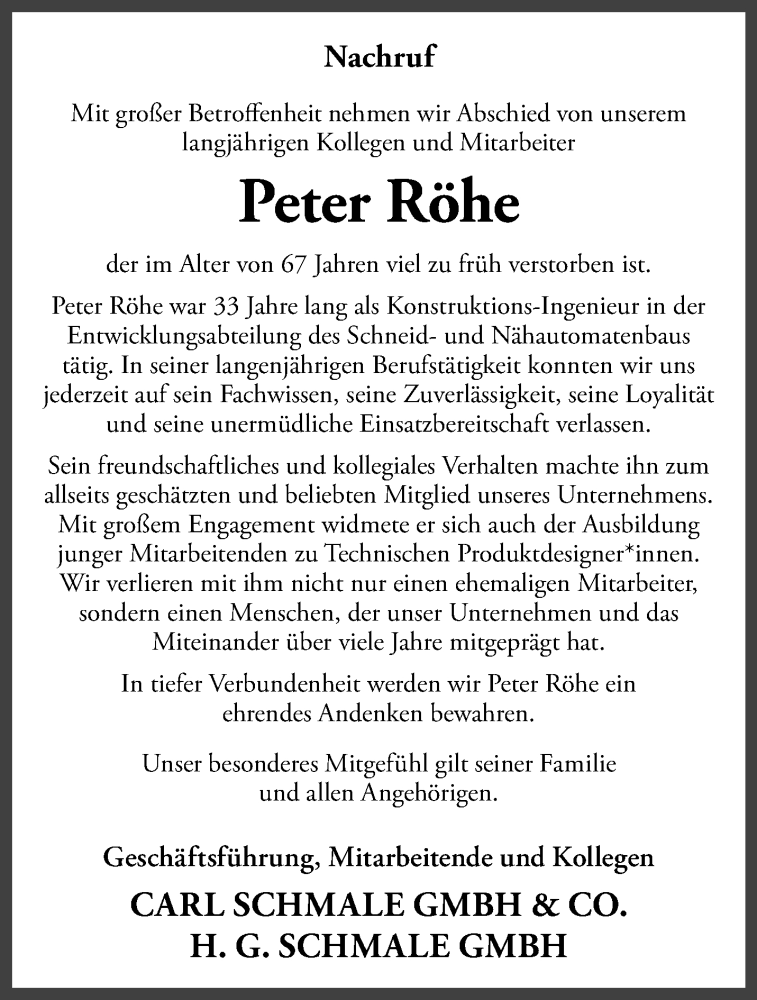 Hier finden Sie alle Traueranzeigen aus der Zeitung, die bisher für Peter Röhe erschienen sind. Weitere Traueranzeigen, die in der Zeitung erscheinen, werden hier ebenfalls aufgelistet