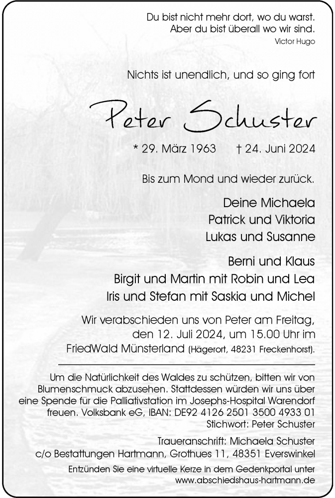 Hier finden Sie alle Traueranzeigen aus der Zeitung, die bisher für Peter Schuster erschienen sind. Weitere Traueranzeigen, die in der Zeitung erscheinen, werden hier ebenfalls aufgelistet