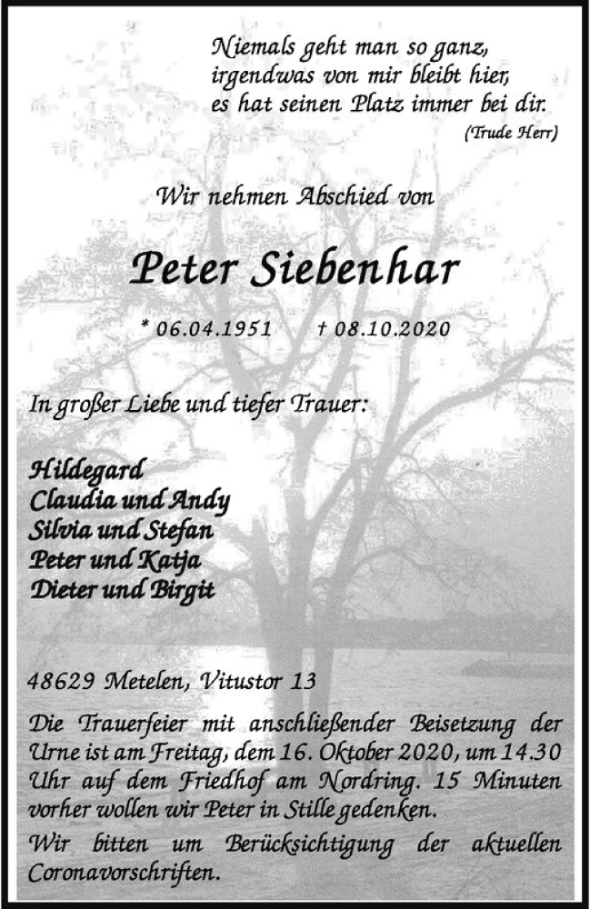 Hier finden Sie alle Traueranzeigen aus der Zeitung, die bisher für Peter Siebenhar erschienen sind. Weitere Traueranzeigen, die in der Zeitung erscheinen, werden hier ebenfalls aufgelistet